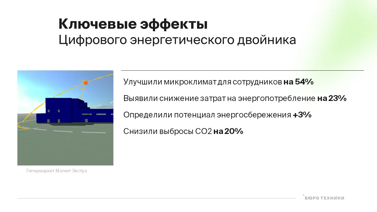 Одним из практических шагов в рамках цифровой трансформации энергетического блока компании стал проект DATA ZOOM. На примере гипермаркета команда Магнита совместно с БЮРО ТЕХНИКИ и при участии студентов Университета ИТМО разработала цифровой энергетический двойник.
