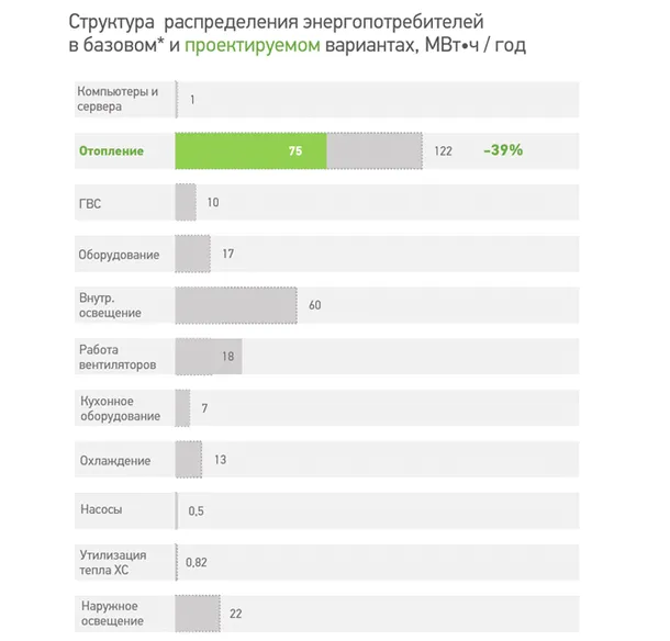 Для снижения энергопотребления на отопление на 39% приняты следующие решения: