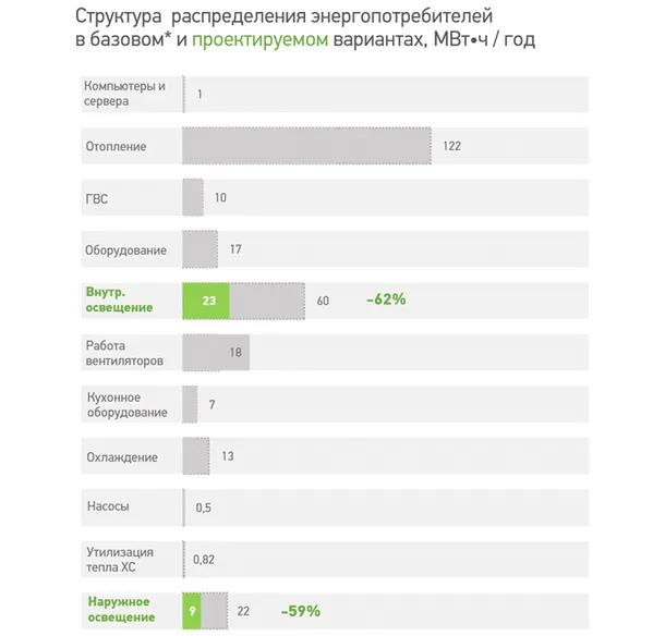Сокращение потребления электроэнергии на внутреннее и наружное освещение составило 62% и 59% соответственно.