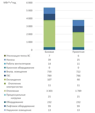 Для определения энергоэффективности здания сравнивается энергопотребление двумя рассчитанными моделями: Проектной и Базовой. Базовая модель – это прототип здания в нормативах 2007 года. Проектная модель – это прототип здания по выпущенной по проектной документации, содержащей энергосберегающие решения. Энергоэффективность здания составила 29% - 8 баллов в системе оценки, что является довольно высоким показателем.
