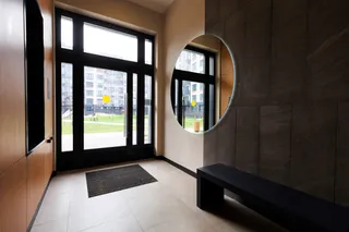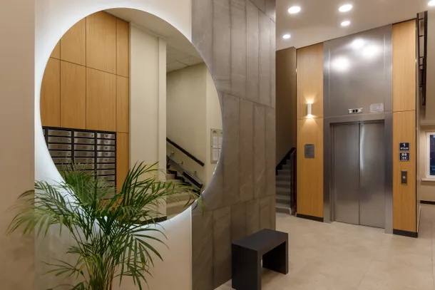 Входы в подъезды — просторные, с широкими дверями: автоматическими или со стопором, чтобы руки оставались свободными. При входе предусмотрен просторный тамбур с креслом и зеркалом, где можно спокойно найти ключ в сумке, поправить одежду или кого-то дождаться, не стоя под дождем. Холлы с удобной и понятной навигацией, лифты оборудованы тактильными табличками со шрифтом Брайля, кнопками с контрастной маркировкой и звуковым сопровождением, чтобы ориентироваться было легко, независимо от особенностей зрения.
