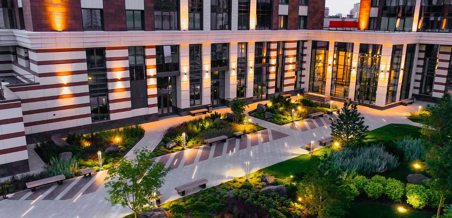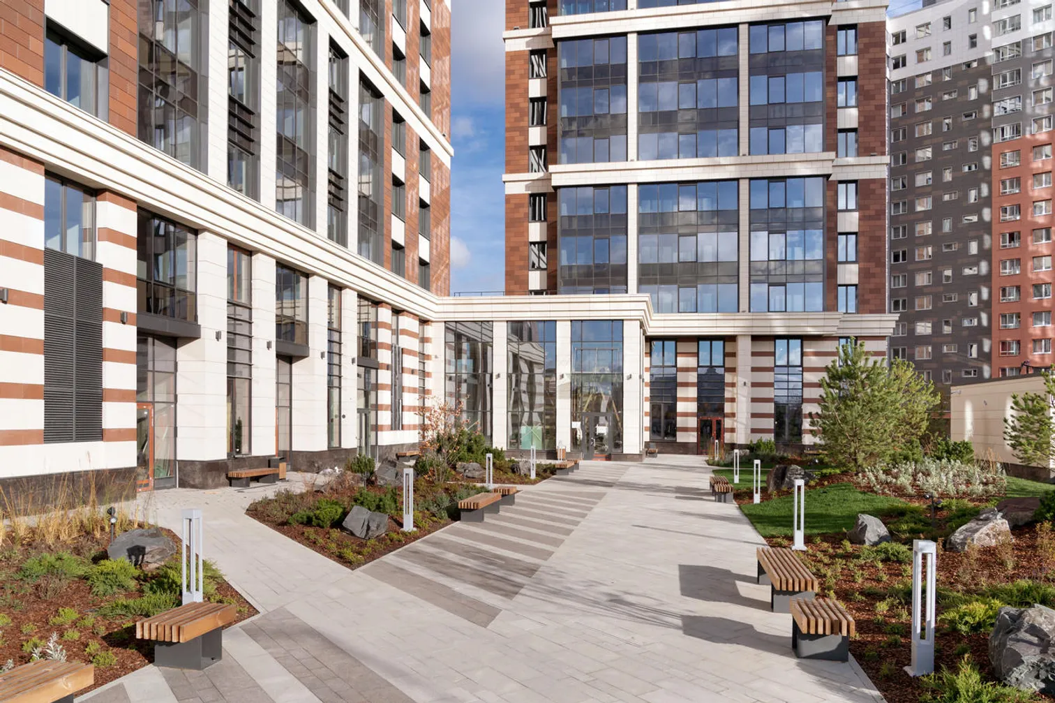 Благоустройство территории предусматривает зоны отдыха для детей и взрослых: игровые и спортивные площадки, беседки, скамейки для отдыха. Особое внимание было уделено озеленению, которое составляет более 40%, и дорожному покрытию территории. Мощение дорожек выполнено из тротуарной плитки светлых оттенков, что значительно сокращает локальный перегрев окружающей среды в теплое время года. Часть дорожных покрытий состоит из георешеток, позволяющих сократить объем ливневых стоков, поступающих в коммунальную систему канализации и улучшить водный баланс территории.