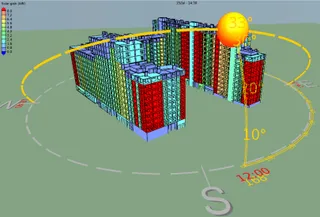 Учёт затенения окружающими объектами, географического положения объекта, его ориентации в пространстве, месяца, времени суток даёт возможность определить теплопоступления и от солнечной инсоляции. Результаты данного расчета становятся частью моделируемых потоков энергии объекта наряду с внутренними нагрузками от оборудования и людей, а также потерями энергии через ограждающие конструкции.
