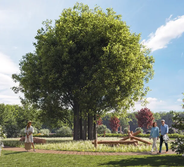 Несмотря на масштабную застройку, была сохранена главная особенность района — черешчатый дуб с 12 стволами, который также лег в основу благоустройства территории застройки. А большое количество разнообразных зон – от спортивных объектов и настольных игр до минипарка и экотропы - обеспечивает жителей приятным досугом.