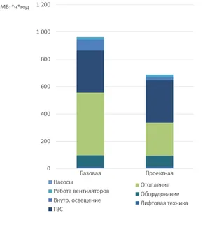 Для оценки энергоэффективности объекта была выполнена его энергетическая модель. Энергоэффективность объекта определяется на основе сравнения энергопотребления Проектируемого здания с энергопотреблением Базового, выполненного согласно нормам, существовавшим на 2007 год.