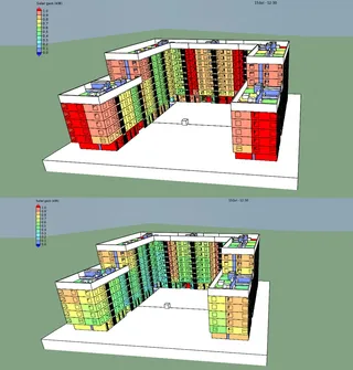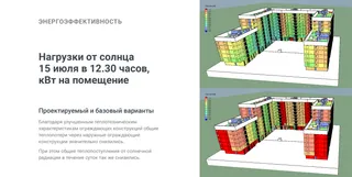 Благодаря улучшенным теплотехническим свойствам ограждающих конструкций общие теплопотери здания значительно снизились Также снизились общие теплопоступления в помещения от солнечной радиации. Они визуализированы для Базового (сверху) и Проектного (снизу) зданий.
