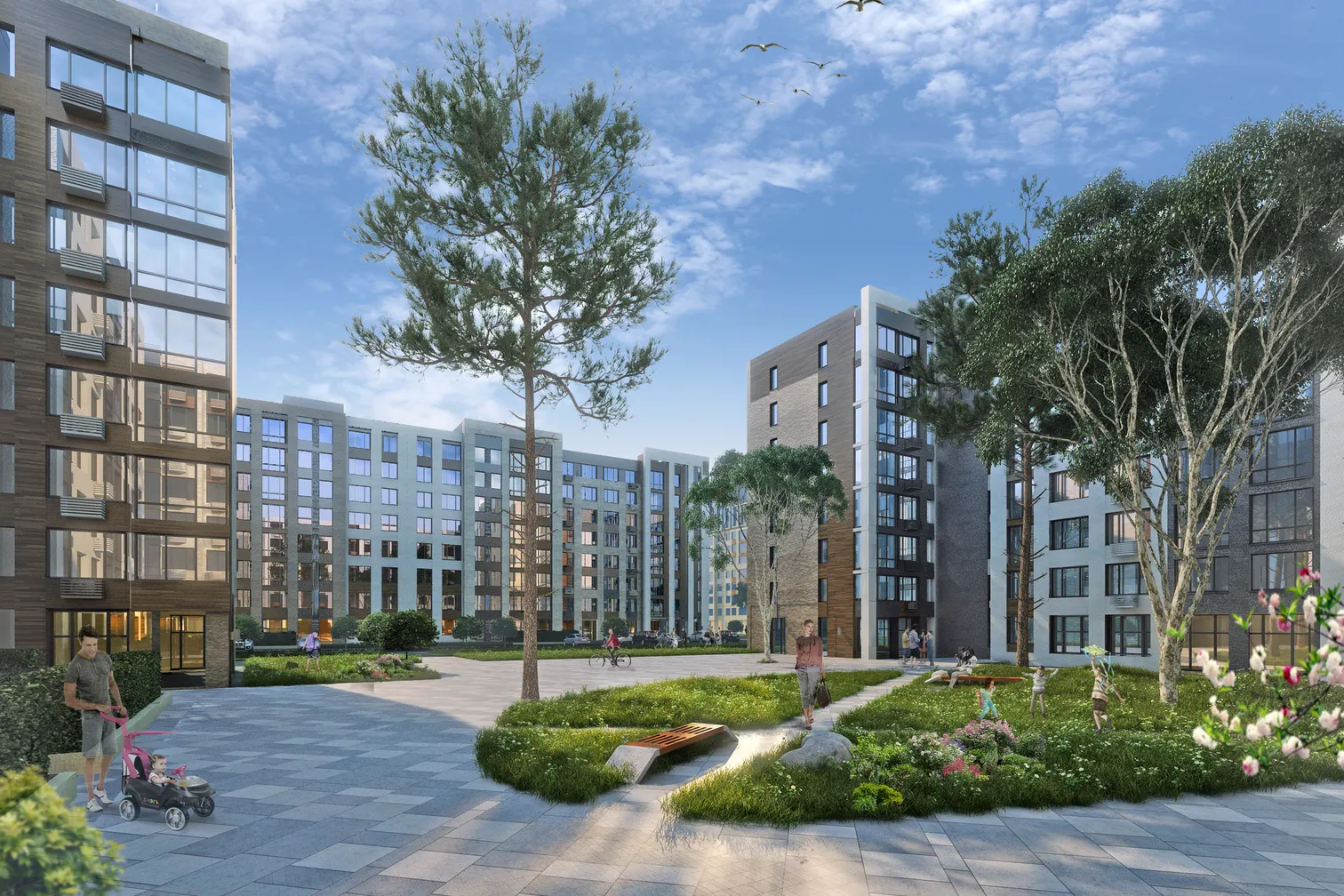 На территории комплекса расположены зоны воркаутов и велодорожки, которые зимой превращаются в лыжные трассы. Для спокойного и тихого отдыха в общественных пространствах предусмотрены перголы, шезлонги и гамаки. Детские площадки выполнены с использованием экологических материалов, нетоксичны, устойчивы к воздействиям климатических изменений и имеют мягкое покрытие. Для домашних питомцев оборудована отдельная территория для выгула, дрессировки и игр на свежем воздухе.