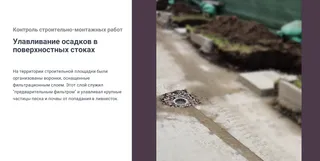 На территории строительной площадки были организованы воронки, оснащенные фильтрационным слоем. Этот слой служил «предварительным фильтром» и улавливал крупные частицы песка и почвы от попадания в ливнесток.