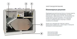Индивидуальные приточно-вытяжные установки квартир SWEGON CASA W80 и W100 оборудованы системой рекуперации с эффективностью 72%. Теплоутилизаторы поквартирных систем используют тепло вытяжного воздуха для подогрева приточного, что позволяет поступать свежему воздуху в квартиру и снижает потребности в обогреве. Кроме этого, приточные установки с рекуператором помогают сделать микроклимат комфортнее. С ними воздух в помещении прогревается более равномерно.