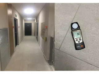 Проверка уровня освещенности в МОП, правильность работы светильников и датчиков движения.