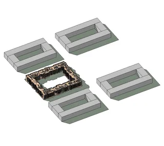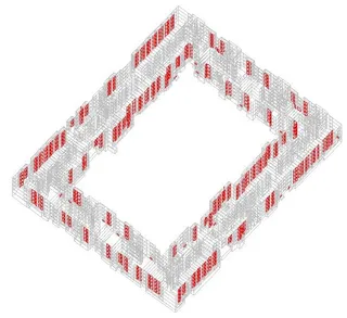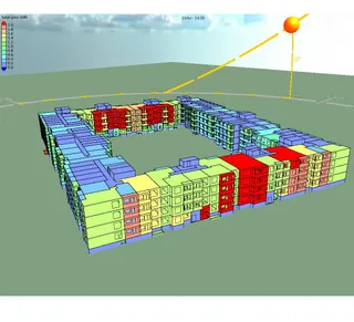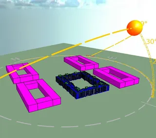 На втором этапе вокруг модели здания создаются соседние строения. Они необходимы для учета теней, которые при определенном положении солнца могут падать на здание и уменьшать нагрузку на его кондиционирование. Поэтому окружающие здания строятся фактической высоты по генплану.
