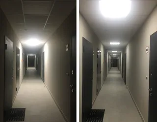 На этажах установлены датчики движения, отключающие часть светильников в отсутствие людей. Также, автоматически включается освещение лестничных клеток и коридоров с наступлением темноты, отключается с рассветом. Решение помогает снизить расход электроэнергии.