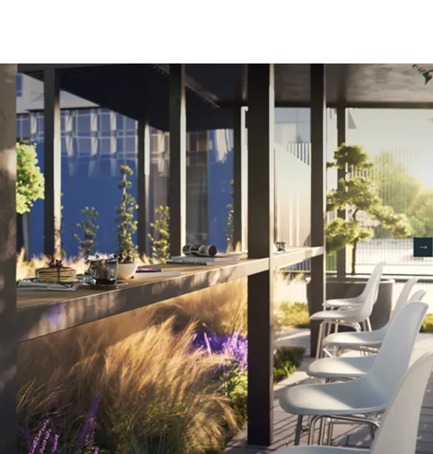 Корпус «Эльбрус» жилого комплекса «Upside Towers» – второй по величине из пяти небоскребов яркого проекта в центре Москвы. Футуристичная архитектура здания и панорамные окна напоминают заснеженные вершины гор, а природные цвета и фактуры еще больше усиливают это впечатление. Дворовая территория корпуса имеет небольшую площадь, однако на ней разместятся сразу несколько функциональных зон, обеспечивающих жителям быстрый доступ к различным активностям. В окружении кустарников и некрупных деревьев, что подчеркивает соразмерность объектов и человека, предусмотрены: воркаут, сенсорный сад, детская площадка, рабочая зона и зона отдыха в многофункциональной перголе. Использование в благоустройстве эффективных светильников, световой поток которых направлен в нижнюю полусферу, позволяет снижать световое загрязнение среды. А материалы пешеходных дорожек светлых оттенков предотвращают перегрев поверхностей в жаркие дни. Для комфорта жителей в здании предусматриваются системы «умного дома», приточно-вытяжная вентиляция с очисткой и подогревом воздуха и возможность управления микроклиматом.