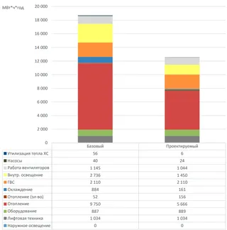 Анализ потребления энергии инженерными системами показал, что системы отопления и освещения являются самыми энергозатратными. Но благодаря улучшенным теплотехническим характеристикам ограждающих конструкций, автоматическому регулированию систем отопления, а также использованию энергоэффективных светильников с управлением по датчикам присутствия удалось сократить потребление энергии в 1,7 раз - на отопление и в 1,9 раз - на освещение.