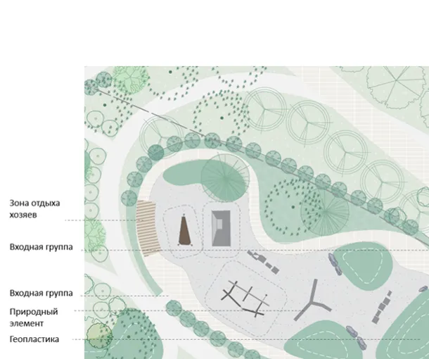 Концепция благоустройства предполагает создание участков с разнообразными активностями: дворовая территория предусматривает наличие рабочей зоны и сенсорного сада для спокойного отдыха. Многофункциональный и всесезонный ландшафтный парк, главной чертой которого является близость человека с природой, включает в себя зону с геопластикой, выполняющую роль защитной полосы от проезжей части, зелёный луг. Подобный контакт помогает обеспечивать удобство пребывания и отдыха на территории, положительные эмоции жильцов.