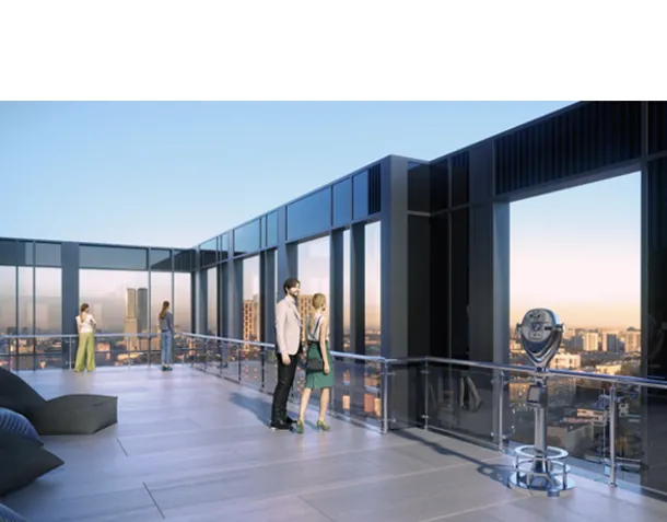 Жителям «Эльбруса» нет необходимости задумываться, где можно отдохнуть и провести время вдалеке от городской суеты. Для максимального использования преимуществ небоскрёба на 55-м этаже для жителей будет обустроена комфортабельная лаунж-зона с кафе и ресторанами, а также персональная смотровая площадка, откуда можно любоваться вечерней Москвой.