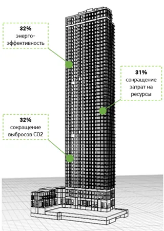 Результаты энергетического моделирования показали, что внедрение энергоэффективных мероприятий позволит достигнуть следующих показателей: общая энергоэффективность - 32%; сокращение выбросов СО2 на 32%; снижение затрат на энергоресурсы на 31%.