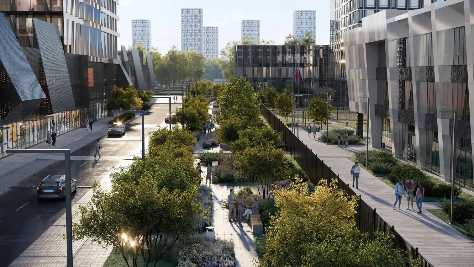 Корпус «Эльбрус» жилого комплекса «Upside Towers» – второй по величине из пяти небоскребов яркого проекта в центре Москвы. Футуристичная архитектура здания и панорамные окна напоминают заснеженные вершины гор, а природные цвета и фактуры еще больше усиливают это впечатление. Дворовая территория корпуса имеет небольшую площадь, однако на ней разместятся сразу несколько функциональных зон, обеспечивающих жителям быстрый доступ к различным активностям. В окружении кустарников и некрупных деревьев, что подчеркивает соразмерность объектов и человека, предусмотрены: воркаут, сенсорный сад, детская площадка, рабочая зона и зона отдыха в многофункциональной перголе. Использование в благоустройстве эффективных светильников, световой поток которых направлен в нижнюю полусферу, позволяет снижать световое загрязнение среды. А материалы пешеходных дорожек светлых оттенков предотвращают перегрев поверхностей в жаркие дни. Для комфорта жителей в здании предусматриваются системы «умного дома», приточно-вытяжная вентиляция с очисткой и подогревом воздуха и возможность управления микроклиматом.